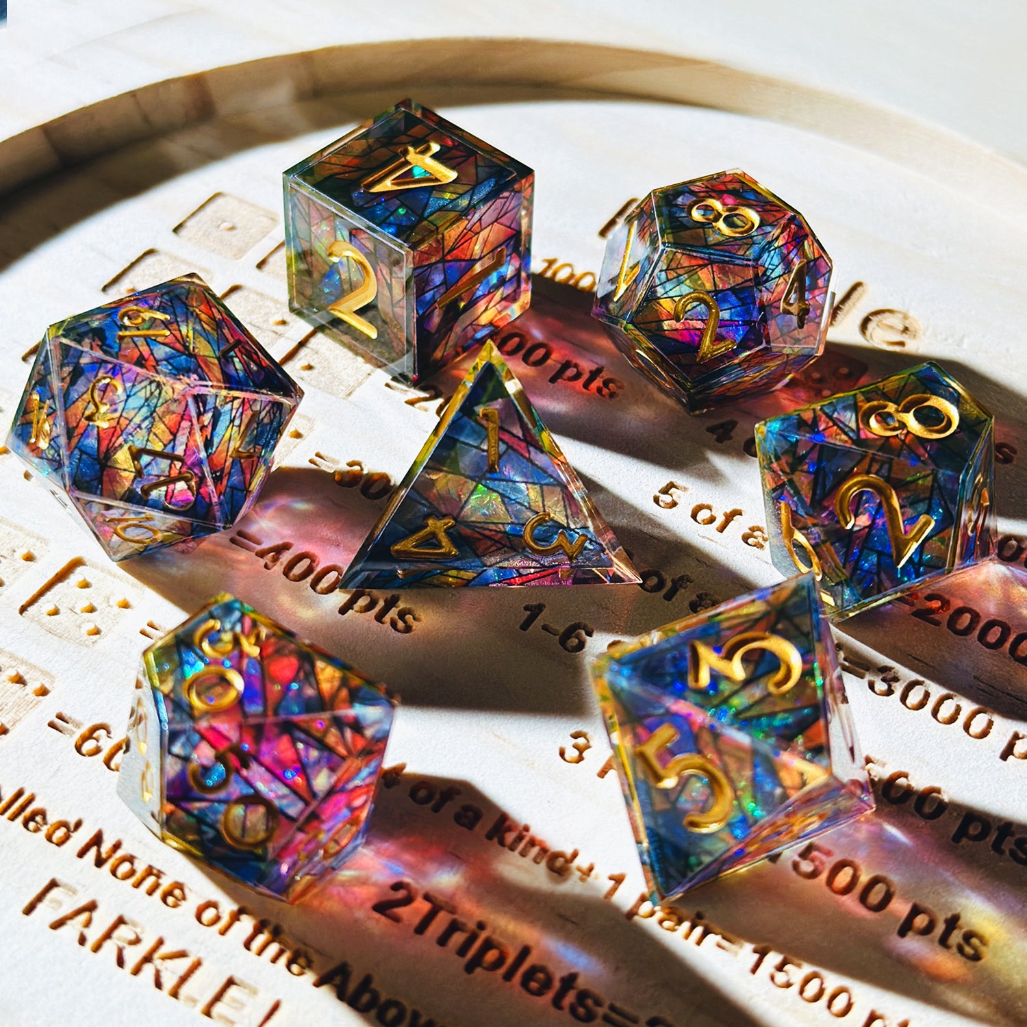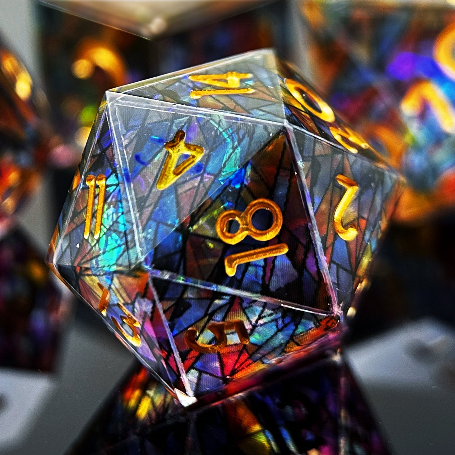 Core Dice: A smaller polyhedral set is first crafted, infused with vibrant, translucent colors that mimic the glow of cathedral windows.