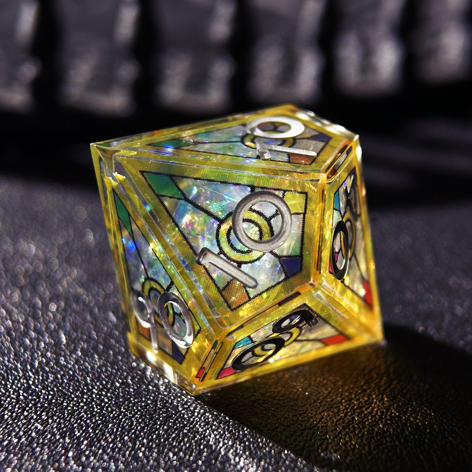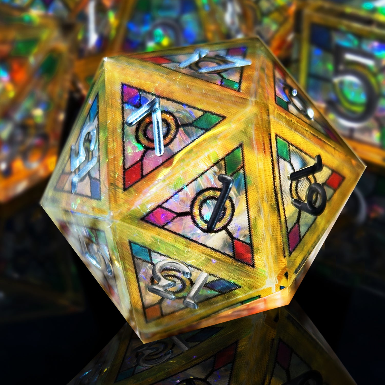 Outer Layer: Encased in a flawless resin shell, the dice gain depth and durability while preserving their radiant "stained glass" illusion.